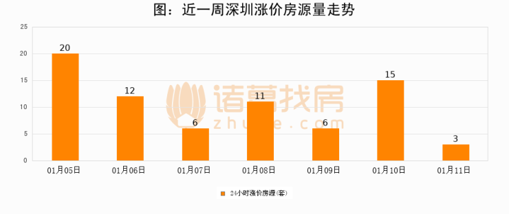 根据诸葛找房数据显示,深圳24小时涨价房源量为3套,较01月10日减少12套,环比下降80%。与此同时,涨价房源占比小幅回落,对于购房者来说是一个入市窗口期,购房者可抓住时机入市。