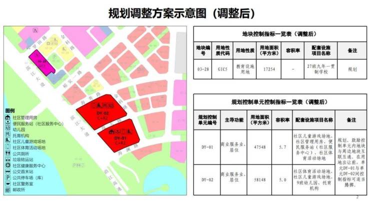 (三)将原03-28、03-32地块合并为03-28地块,用地性质由商业调整为教育设施用地,用地面积调整为17254平方米,配套设施为“27班九年一贯制学校”。