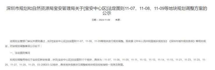 11月9日,深圳市规划和自然资源局宝安管理局发布了一则关注宝中地块调整方案的公示。根据公示内容,本次调整涉及17个地块,其中包括14宗商业性办公用地、1宗旅馆业用地规划、2宗公共绿地。合并后调整成为,2宗商业服务业+居住用地、1宗教育用地。