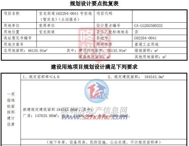 宗地号G02204-0041,土地位置龙岗区宝龙街道,土地用途普通工业用地,准入行业类别工业机器人制造、新能源产业,土地面积46135.91平方米,建筑面积184543平方米,挂牌起始价6580万元,土地使用年限30年。