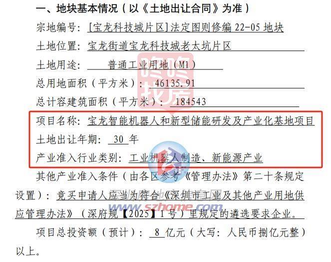 根据产业监管协议显示,该地块将建设宝龙智能机器人和新型储能研发及产业化基地项目。