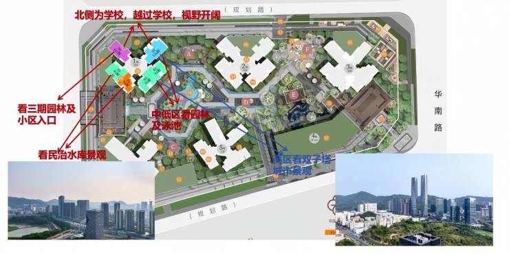 即将推售的 1 栋是鹏宸云筑首次推出的超高层住宅,楼栋位于整个东地块的西北,楼栋南向低区俯瞰花园,高区远眺民治水库和塘朗山,北侧则是规划的九年一贯制学校,高区视野佳,这栋楼的整体景观素质是非常好的。