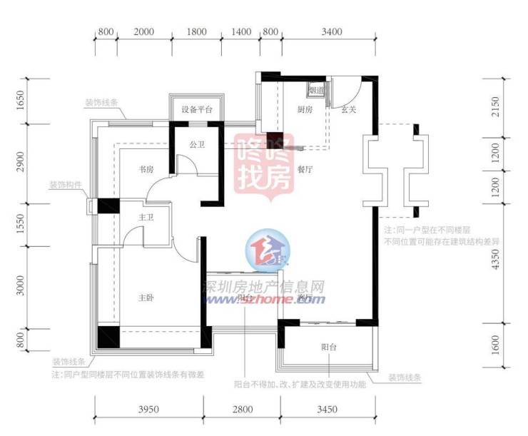 稀缺小户型产品,成长空间户型。可视为 A 户型加强版,餐厅位+1 空间可根据家庭需求做开放功能空间,也可做独立空间使 用。从而在 91 ㎡里实现四房功能空间,是深圳目前最小面积可做四房的新房,综合使用率约 100%。