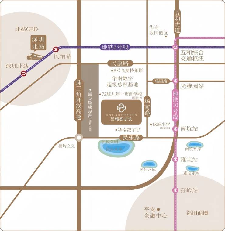 同时,项目直线距离地铁 10 号线南坑站约 600 米,2 站进入福田地界,4 站可达深圳北 , 5 站到达岗厦北,约 8 公里(直线距离)直达福田 CBD。