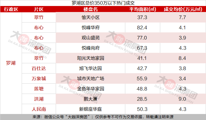 并列第一的是翠竹的愉天小区与布心的悦峰华府,两小区各成交17套,而均价则分别为7.7万元/㎡与4.1万元/㎡。