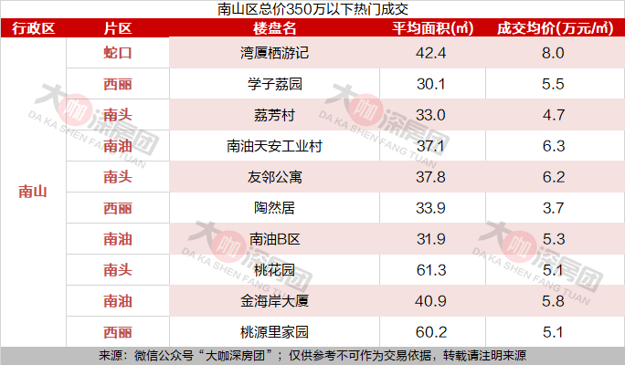 南山区350万内均总价的成交榜都是30-40㎡的小户型居多。