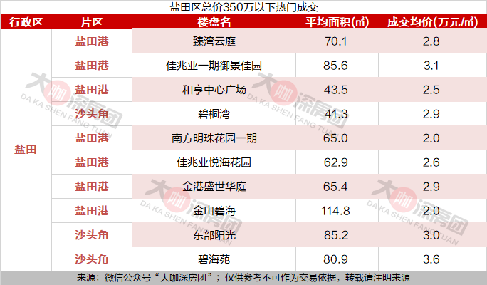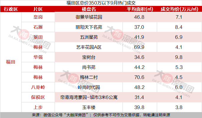福田区均总价350万内,成交量最高的是皇岗的御景华城花园,9月共成交了11套,目前均价在7.1万元/㎡。