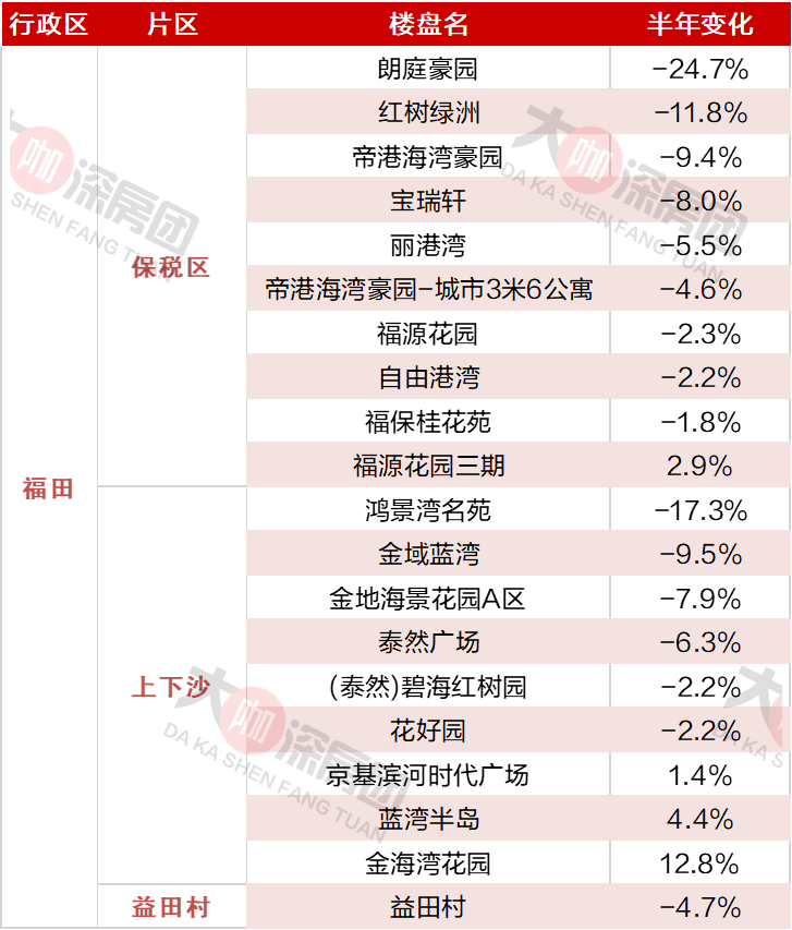 再看福田区。一方面由于关口的原因,再因为小区面积过大,福田区的保税区和益田村可谓是居家的“常客”。与之相邻的上下沙片区,也经常受到疫情的影响。从表中我们能看到,朗庭豪园、鸿景湾名苑、红树绿洲的跌幅情况明显,此外福田区的楼盘跌幅基本都在10%以内。并且从三个片区对比来看,保税区的跌幅情况最严重,上下沙相对波动略少,益田村整体房价跌幅为4.7%。福田区有四个楼盘价格呈现为上涨:福源花园三期、京基滨河时代广场、蓝湾半岛、金海湾花园。