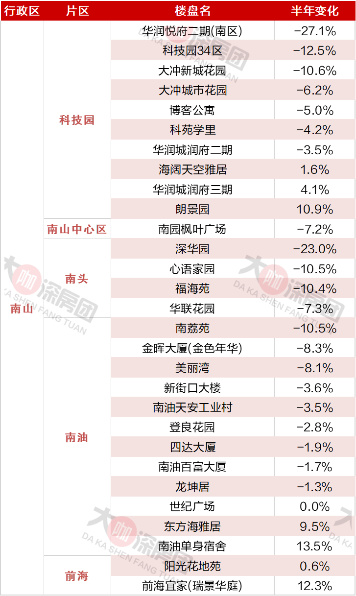 最后我们来看一下南山区的情况。南山区的科技园片区的华润悦府二期(南区)跌幅最为明显,达到了27.1%;其次是南头片区的深华园也有23%的跌幅。