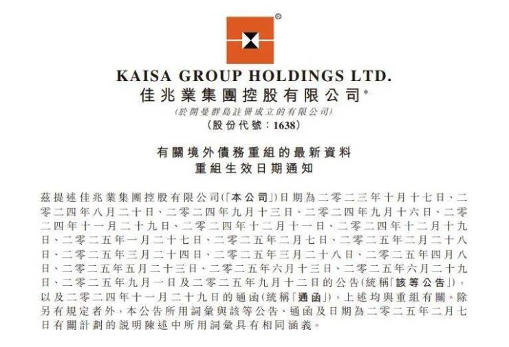 9月15日,佳兆业集团控股有限公司(股票代码:1638.HK)宣布,其境外债务重组所有条件均已达成,重组方案已全面生效。