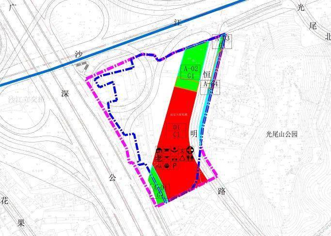 由于涉及基本生态控制线,因公共利益原因将E-01地块细分为E-01-1、E-01-2两个地块,其中E-01-1地块面积36660.5平方米,用地性质为R2+C1(二类居住用地+商业用地);E-01-2地块面积564.1平方米,用地性质为G1(公园绿地)。