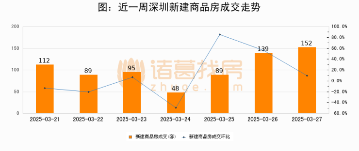 根据深圳市住房和城乡建设局数据显示,2025年03月27日深圳新建商品房成交152套,较昨日增加13套,环比上涨9.3%