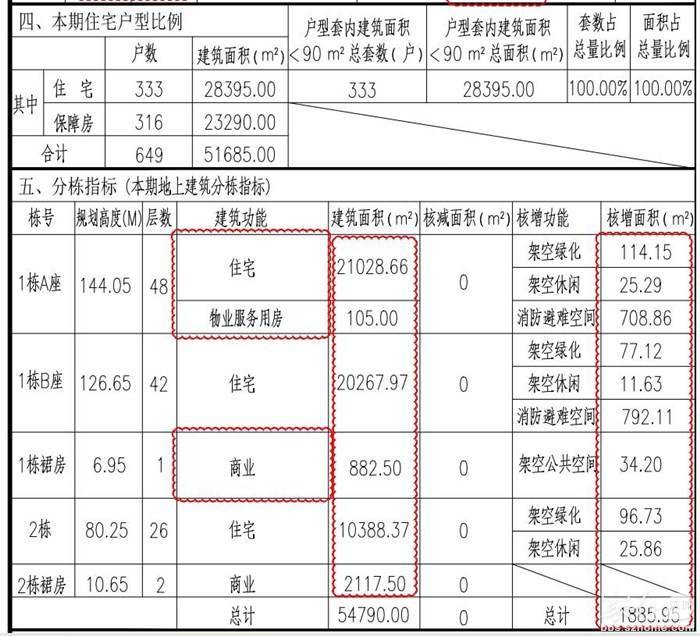 其中住宅136552平方米(其中保障性租赁住房23700平方米)、物业服务用房300平方米、商业3000平方米、邮政支局2000平方米、幼儿园3500平方米(用地面积2700平方米,班数9个)、文化活动室1500平方米、社区老年人日间照料中心2000平方米、社区警务室30平方米 。