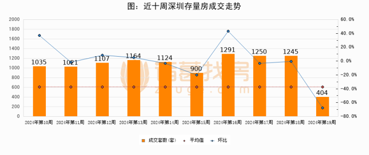 存量房方面,第18周深圳存量房成交404套,较上周减少841套,环比下降67.5%。从近十周成交走势来看,周均成交套数为1054套,本周低于平均水平61.7%。