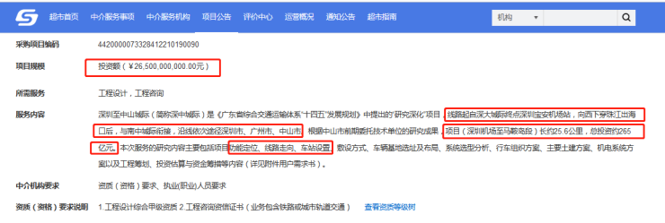 公告服务内容中提到,深圳至中山城际(简称深中城际)是《广东省综合交通运输体系“十四五”发展规划》中提出的“研究深化”项目。