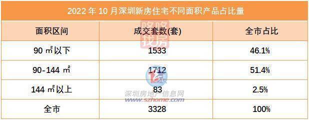 2022年10月深圳成交3328套新房住宅,其中90㎡以下的产品成交1533套,占全市总量的46.1%;90-144㎡改善型产品成交1712套,占总量的51.4%;144㎡以上的产品成交83套,占总量的2.5%。