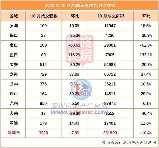统计数据显示:2022年10月深圳成交3328套新房住宅,环比减少7.9%;成交面积331890平方米,环比减少10.4%。光明、龙岗、宝安是全市的主力成交区域。