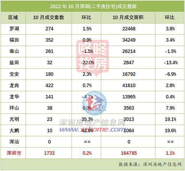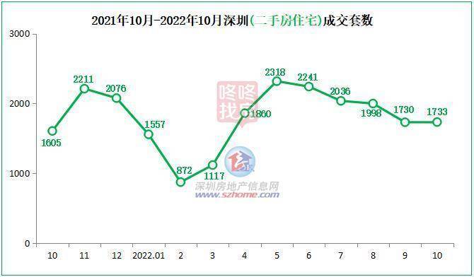 统计数据显示:2022年10月深圳成交1733套二手房住宅,环比持平;成交面积164785平方米,环比增加1.1%。