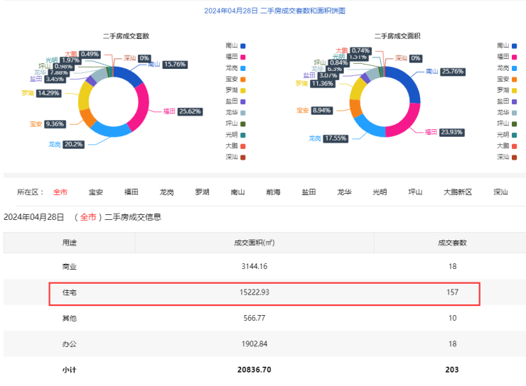 2024年4月28日二手房住宅网签157套。宝安15套;福田32套;龙岗34套;罗湖25套;南山29套;盐田6套;龙华10套;光明3套;坪山2套;大鹏1套。