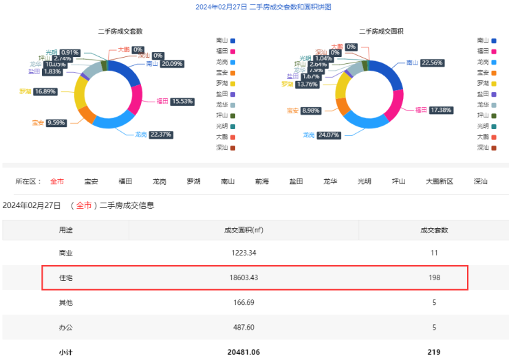 2024年2月27日二手房住宅网签198套。宝安20套;福田31套;龙岗44套;罗湖30套;南山42套;盐田3套;龙华20套;光明2套;坪山6套;大鹏0套。