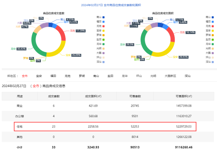 2024年2月27日新房住宅共网签23套。宝安6套;福田1套;龙岗4套;罗湖0套;南山1套;盐田0套;龙华7套;坪山0套;光明2套;大鹏2套;深汕0套。