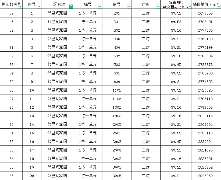 房源量:38套,其中:两房户型房源20套,建面约69㎡;三房户型房源18套,建面约88㎡