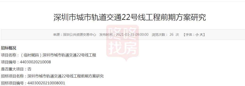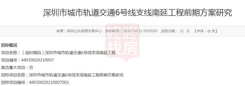 3月22日,深圳公共资源交易中心发布6号线支线南延、22号线工程前期方案研究招标。