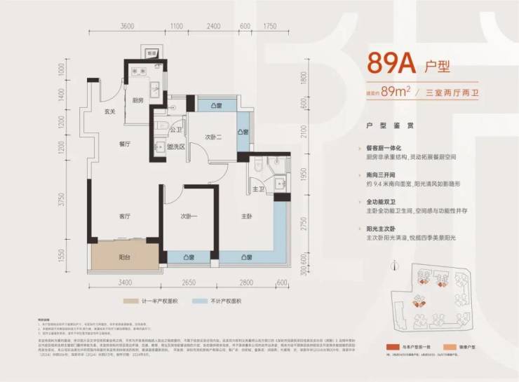户型平面分布如下,建面约89㎡的户型超园林。