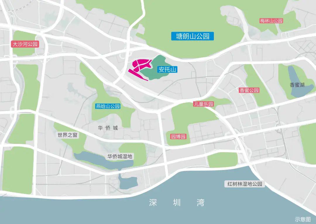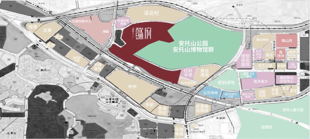 深铁懿府在安托山片区的西侧,环安托山公园而建,生态及景观资源突出。所在的片区区位虽称不上中心,但放大到稍大一点的视角来看,它恰好位于华侨城片区和香蜜湖片区的圈层中心。