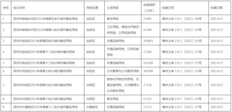 又有9个批次城市建设用地获批,宝安、光明有近3万㎡居住用地