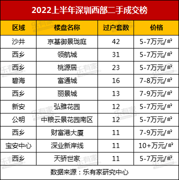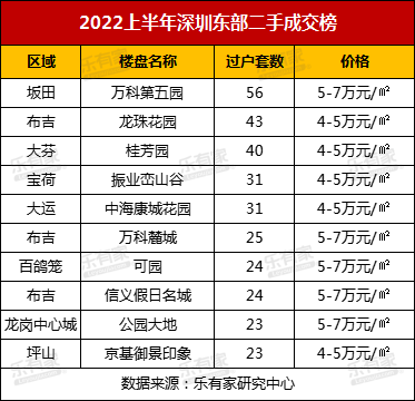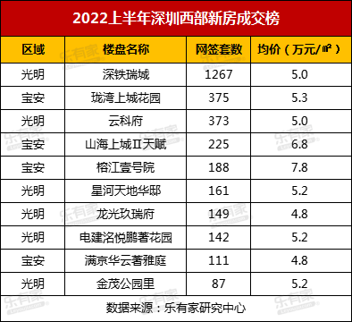 乐有家研究中心整理了2022上半年(1-5月)深圳东西部新房成交量排行榜。东部排名前列名的是龙岗中心城的合正方州润园,均价在4.8万元/㎡左右。西部排名前列名是光明的深铁瑞城,均价5万元/㎡左右。