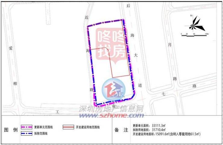 更新单元用地面积为33111.3平方米,拆除用地面积为31710.4平方米,开发建设用地面积为15091.6平方米,规划容积98754平方米,容积率为6.5;教育用地约1.5万平,另外还有少量公园绿地。