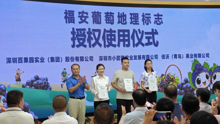 活动现场,福安市农业农村局副局长郭恒坚为深圳百果园实业(集团)股份有限公司、深圳市小甜甜农业发展有限公司、佳沃(青岛)果业有限公司颁发了福安葡萄地理标志授权使用证书。以“福安葡萄入深融湾”为切入点,搭建平台、拓宽渠道、创新展销、多方联动,在乡村振兴双中心强大的载体与平台支撑下展开福安区域品牌打造及推广,推动福安优质产品融入粤港澳大湾区,促进福安深圳两地文化与经济的深度融合,为乡村振兴新发展格局之下的高质量发展注入新动力。