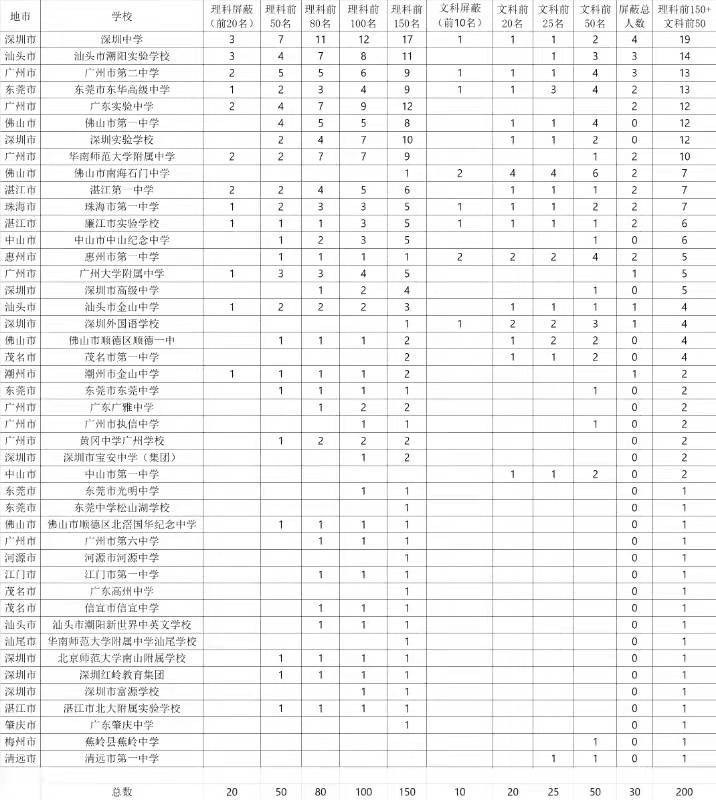 深中的实力是毋庸置疑的,去年(2021年),一张关于2021年广东省理科前150名、文科前50名,以及屏蔽生的各学校人数盘点表流出,从表里可以看到,深圳的中学表现非常抢眼,尤其是深圳中学,稳居排名前列。