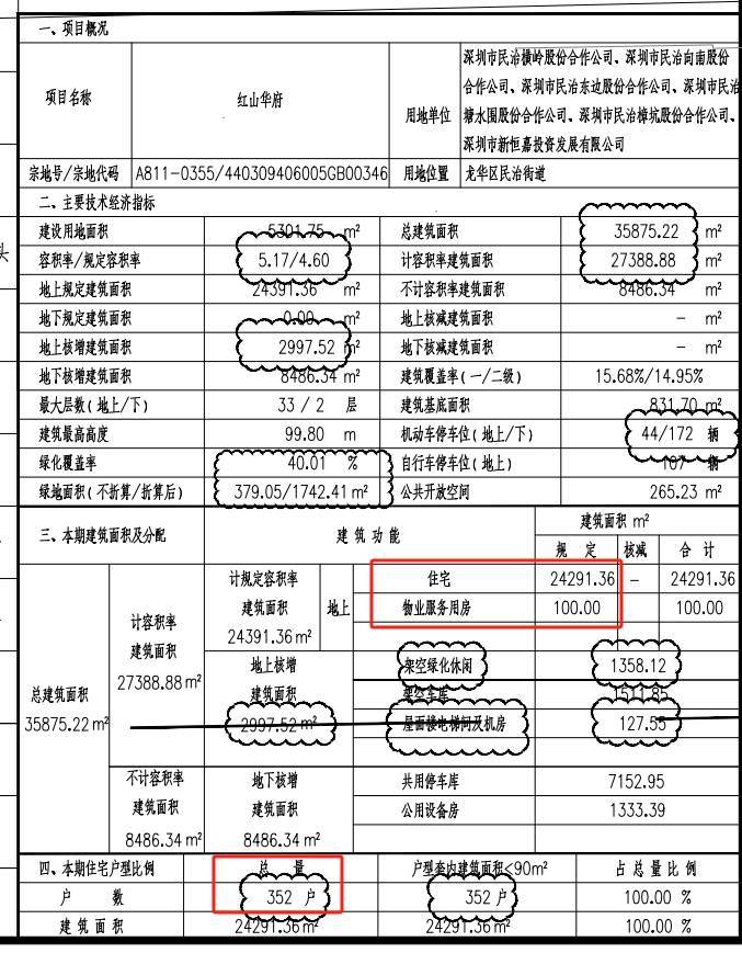项目总共有352户,其中商品房186户,其余都是回迁房。这里需要注意的是,项目总车位数220个,车位比1:0.63,车位略为紧张。