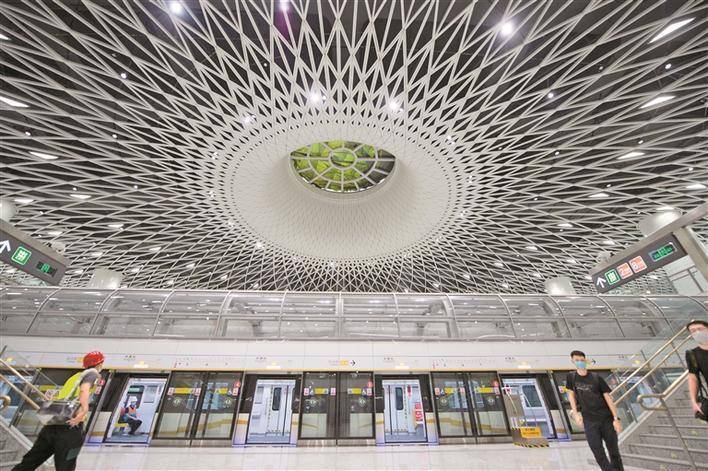 在试乘排名前列站岗厦北枢纽的站厅层,记者看到,整个枢纽的科技感和视觉冲击感十足,枢纽为地下两层结构,内部采用中庭设计,可将阳光引入地铁空间,宽敞明亮。而沿着地面一路向车站站台走去,映入眼里的是整座枢纽的中心景观“深圳之眼”。