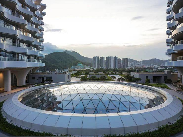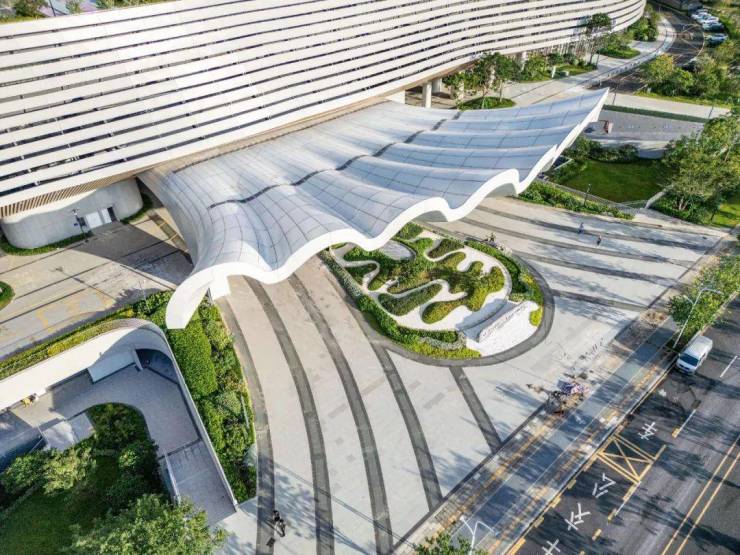 建筑在造型上颠覆了人们对于传统医院的固有印象,两栋圆形塔楼高低错落,悬浮于裙楼之上,与裙楼基座共同形成有机整体。设计还利用波浪形阳台、飘带等具有滨海建筑风格的元素,烘托山海建筑氛围,带给就医者视觉享受的同时,也营造了诗意的疗愈环境。