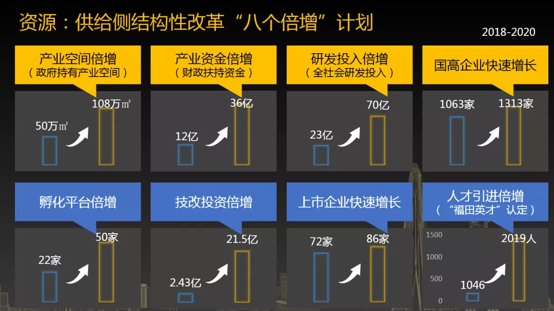 2017年11月,福田区出台《福田区推进供给侧结构性改革八项倍增计划实施方案》,涵盖产业空间、产业资金、研发投入、国高企业、孵化平台、技术改造、上市企业、人才引进等八大领域、21个指标,用2-3年的时间实现倍增。