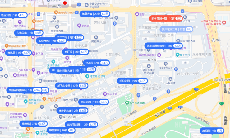 距离地块最近的住宅小区,是越华路西侧的凯丰花园一期(1997-2002年建成)、凯丰花园二期(2005年建成),以及凯丰综合楼(1999年)。