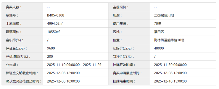 11月10日,深圳公共资源交易中心公告了一宗位于福田梅林街道的二类居住用地。