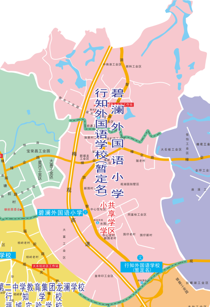 划分说明:与观澜第二中学教育集团观澜第二小学、龙华区第三外国语学校小学部部分学区组成共享学区,2024年拟借址龙华区第三外国语学校。