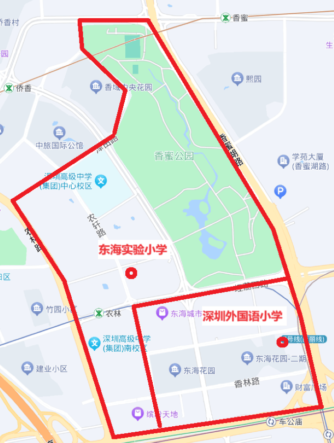 东海实验小学招生地段:农林路以东、泽田路及侨香路以南、香蜜湖路及农轩路以西、红荔西路及深南大道以北合围区域。