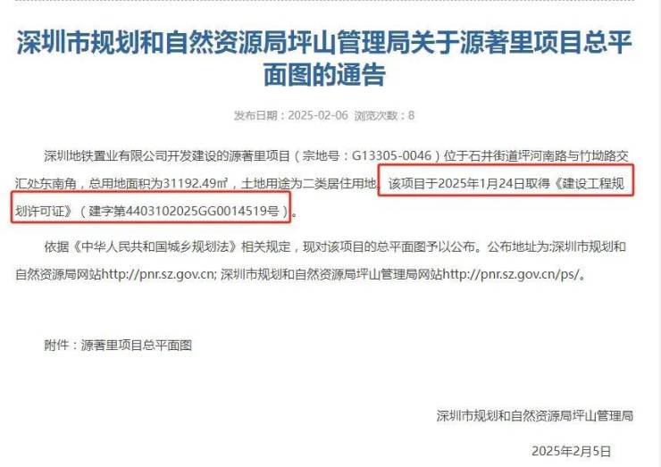 据坪山管理局公告,项目于2025年1月取得了施工许可证,规划商品住宅超9万㎡,预计供应超千套住宅房源。