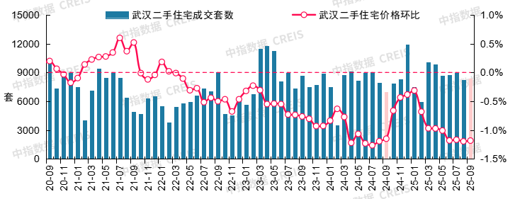 图:2020年9月至2025年9月武汉二手住宅成交套数及二手住宅价格环比走势