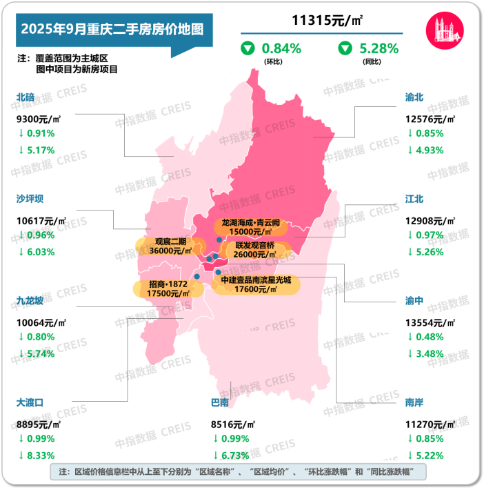 9月,重庆二手住宅成交均价为11315元/m²,环比下跌0.84%,同比下跌5.28%,同环比跌幅均有所扩大,价格仍面临较大下行压力。分区域来看,渝中跌幅相对较小,大渡口、巴南环比跌幅相对较大。