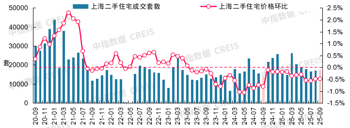 图:2020年9月至2025年9月上海二手住宅成交套数及二手住宅价格环比走势