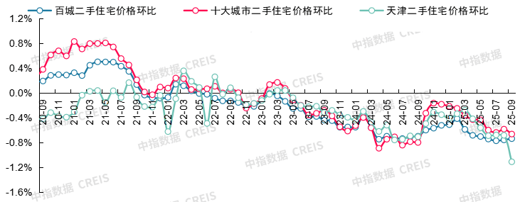 图:2020年9月至2025年9月天津二手住宅价格环比走势