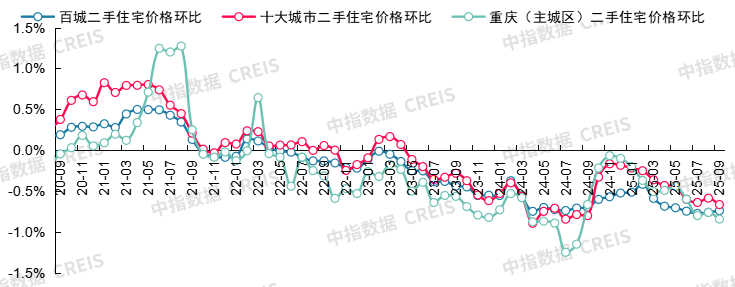 图:2020年9月至2025年9月重庆二手住宅价格环比走势