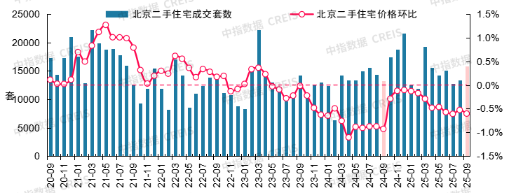 图:2020年9月至2025年9月北京二手住宅成交套数及二手住宅价格环比走势