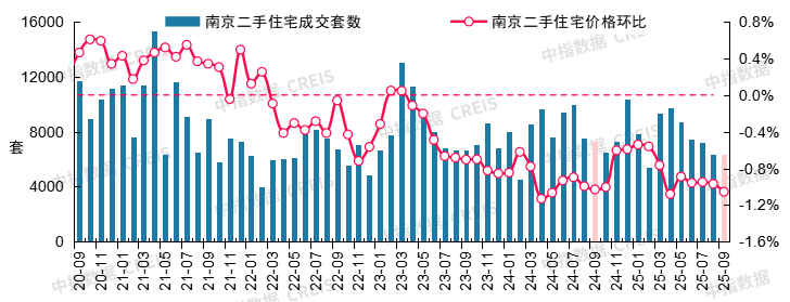 图:2020年9月至2025年9月南京二手住宅成交套数及二手住宅价格环比走势